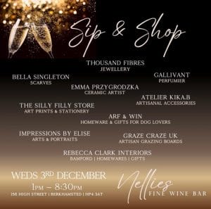 Sip and Shop at Nellie’s Fine Wine Bar in Berkhamsted on Wednesday 3rd December from 1pm onwards